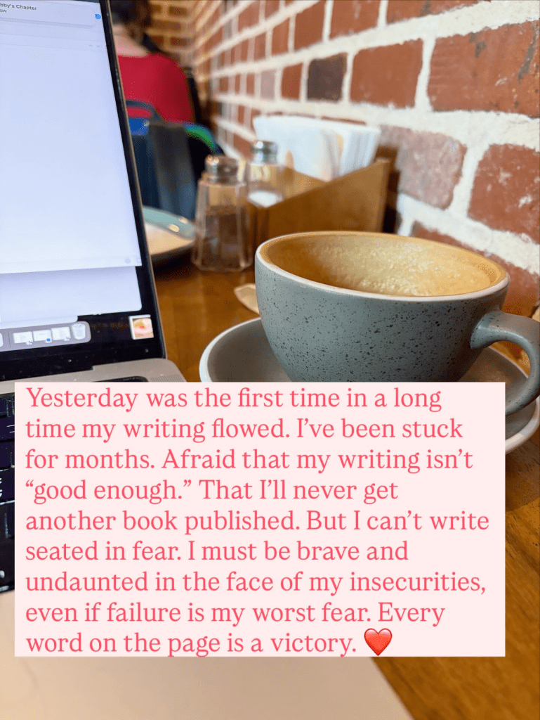 I’m still scared. I love this story I’m working on. I want to tell it as I see it playing out in my head. This is a dangerous mentality/dream/intention. Getting it “perfect” is what editing is for. It’s why get feedback from our agents and beta readers.